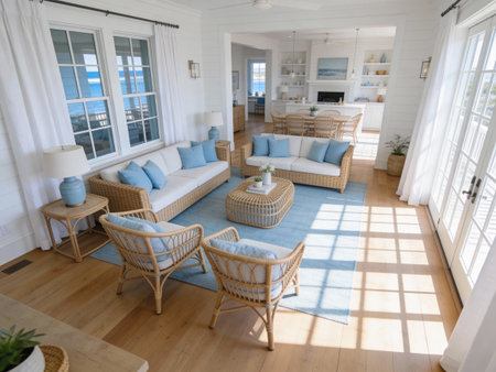 Interior design of Living Room in Coastal style with Large windows with ocean view decorated with Woven rattan chairs, jute rug material. Coastal architecture. Generative AI AIG24.