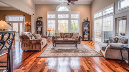 An elegant living room with polished floors and organized decor, epitomizing cleanliness and style.