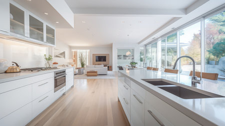 interior of new modern house, white kitchen and living room view