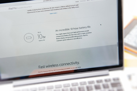 PARIS, FRANCE - SEP 10, 2015: Apple Computers website on MacBook Pro Retina in a creative room environment showcasing the newly announced iPad Pro and its battery life