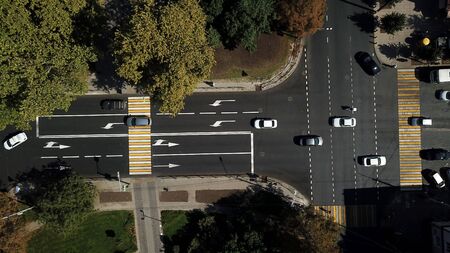 Major asphalt road intersection with multiple highways lanes, with a traffic light a pedestrian crossing, seen from aerial panorama view