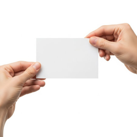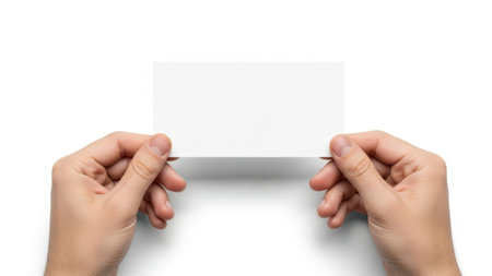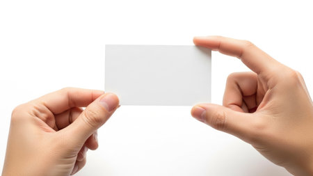 A close-up image of two hands holding a blank business card against a white background.