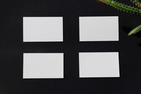 Top view of white business cards in pattern on dark wooden background, use for mock up branding identity