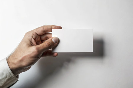 The image depicts a hand delicately holding a blank business card against a pristine white background. The fingers are gently curled around the edges of the card, with the thumb supporting the bottom. The hand's shadow is cast on the background, adding depth to the otherwise minimalist composition. The simplicity of the image emphasizes the importance of professionalism and networking.