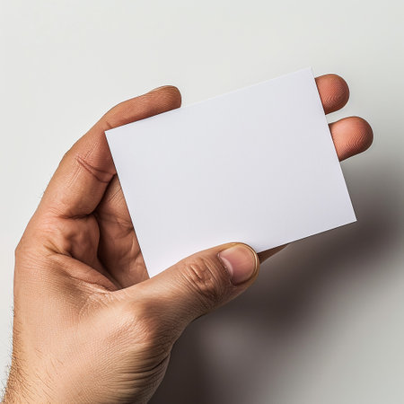 The image depicts a hand holding a blank white card against a light-colored background. The card is rectangular and appears to be made of paper. The hand is positioned in such a way that the fingers are visible, holding the card by its edges. The background is plain and minimalistic, providing a stark contrast to the white card and the hand. The image focuses on simplicity and minimalism, emphasizing the blank card as the central element.