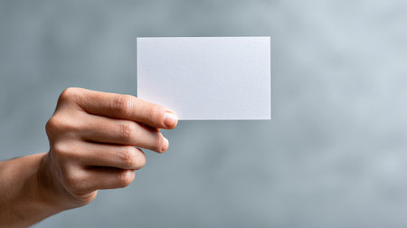 Hand holding a blank white business card, offering ample copy space against a softly blurred gray background. Perfect for showcasing corporate identity and branding elements