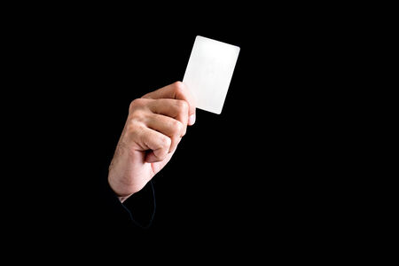 Hand holding a white card isolated on black background