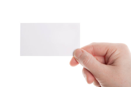 Hand holding blank business card isolated on white background