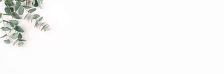 Floral background. Minimalist natural decor. Green eucalyptus twig on white. Copy space.