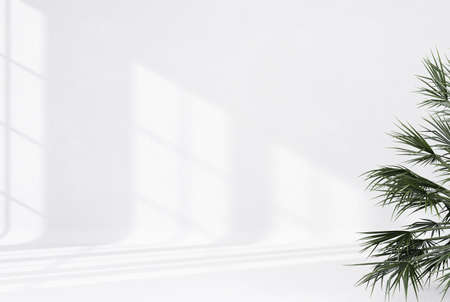 Abstract white studio background for product presentation empty room with shadows of window and flowers and palm leaves 3d room with copy space summer concert blurred backdrop. 3D Rendering