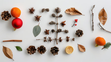 Christmas card elements arranged in a minimalist flat lay composition on white background AI generated illustration