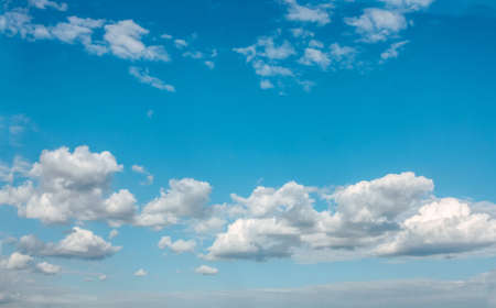 Blue sky with fluffy clouds on a windy day in spring. Abstract template with copy space