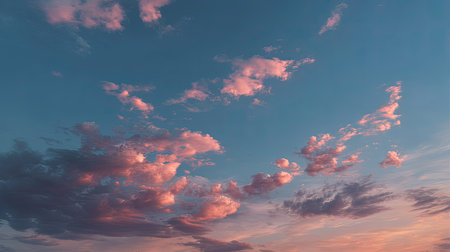 A beautiful evening sky showcasing soft pink and orange clouds against a blue backdrop, evoking feelings of serenity and peace in nature.