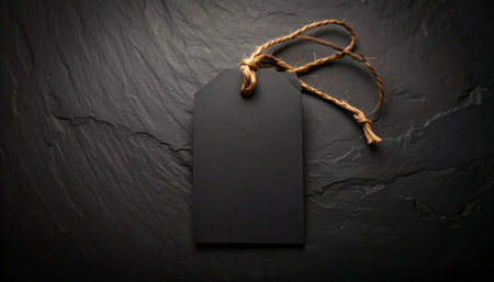 Realistic single matte black blank price tag with brown twine loop, placed flat on dark black slate stone background, soft top light, minimal premium concept,