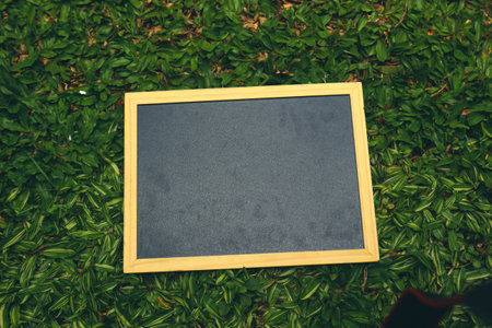 A small black blackboard with a wooden frame sits on the green grass. Suitable for your template related to education in the environmental field.