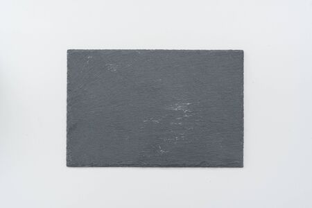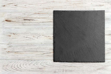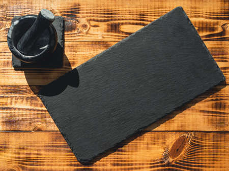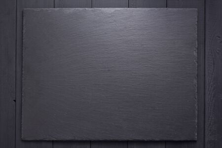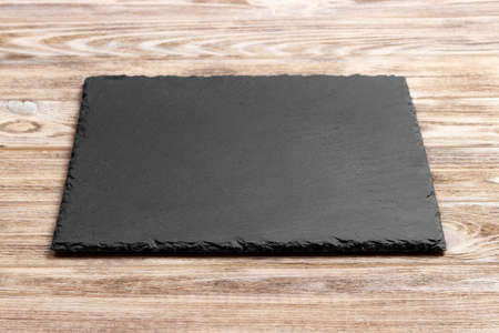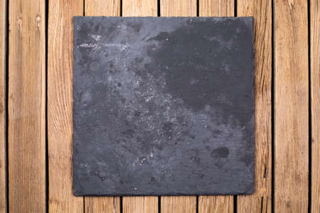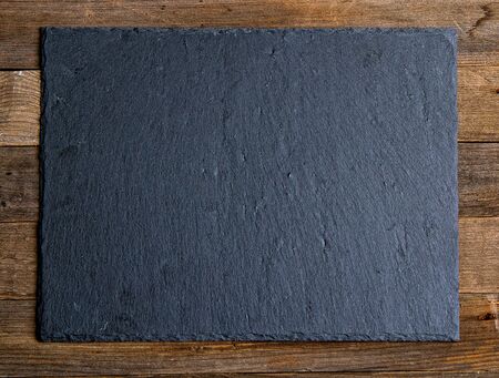 Slate board on wooden background. Cutting board. Space for text. Top view.