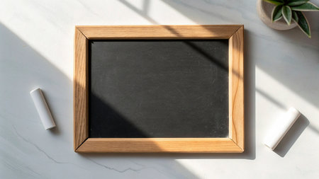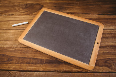 Chalkboard with wooden frame is resting flat on wooden tabletop in flat design, showing white chalk. Minimalist, rustic, educational, workspace, craft, decoration, vintage