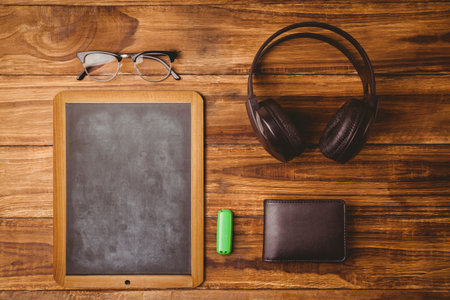 Small chalkboard is sitting on wood desk in flat design, showing glasses, headphones, wallet, USB. Minimalist, workspace, organization, technology, accessories, modern, productivity