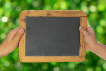 Children holding blackboard blank in hands against green spring blurred background. Ecology concept. Copy space