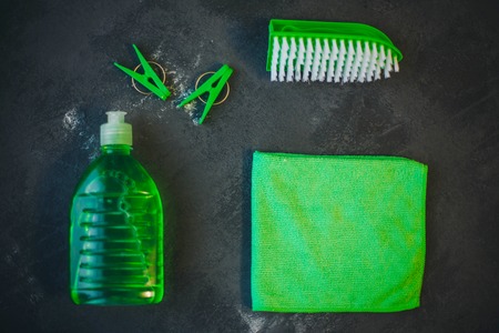 Cleaning house or office concept. A set of green cleaning supplies on a dark concrete background, mock up,top view, flat lay