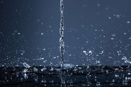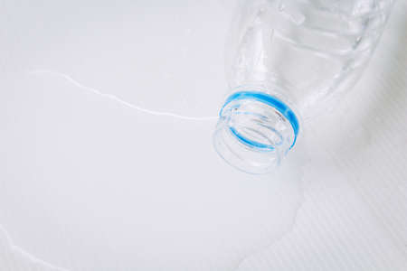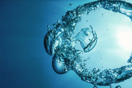 Splash of water from a bottle on a blue background. Reflection on the surface of the water.