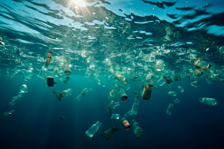 Plastic pollution in Ocean. Underwater with garbage floating on a sea - environmental problem. Plastic bottles and bags pollution in ocean. AI generated
