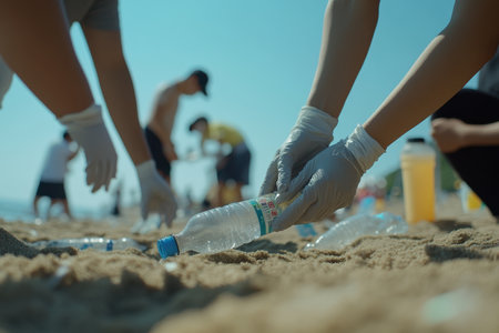 Volunteers working together to clean up plastic pollution on the beach as part of an environmental conservation initiative