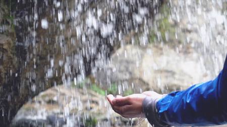 Close-up image shows hands cupping clear water, with droplets and splashing effects. The texture is detailed, with a focus on liquid movement and interaction. The lighting appears soft, indicating an indoor or shaded environment. Suitable for conceptual illustrations related to resources and hygiene.
