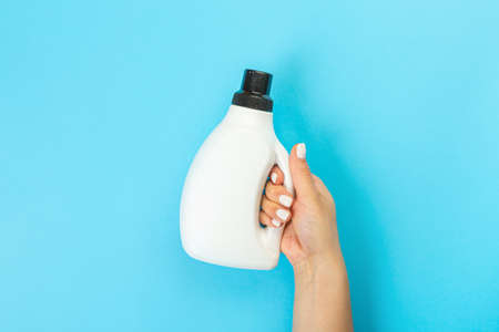 Housewife's hand holds a spray with cleaning agent on a blue background. Detergent for various surfaces in the kitchen, bathroom and other rooms. close-up. Light pastel blue background.