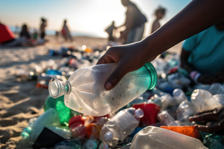 Beach cleanup volunteers gather discarded plastic bottles, promoting environmental sustainability and community engagement under a clear sky.