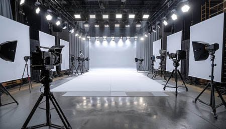 A professional film studio with multiple cameras and lighting equipment setup for filming or photography.