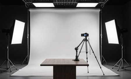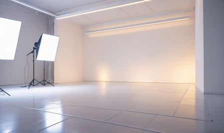 A modern and spacious professional photography studio setup is presented, featuring a pristine white backdrop and a comprehensive array of lighting equipment. This ready-to-use studio offers a clean, minimalist environment, perfect for diverse creative photo sessions. The scene showcases various elements, including lights, softboxes, reflectors, and a camera tripod, creating an ideal workspace. This versatile image is suitable for illustrating concepts of photography, studio work, professional settings, or blank space ready for content.