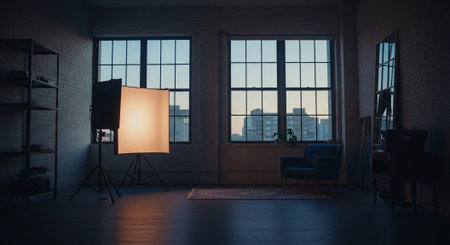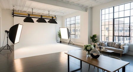 A bright photography studio featuring large windows, softbox lights, and a minimalist backdrop, perfect for professional photo shoots and creative projects.