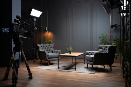 Studio for interview and podcast. Two empty chairs and spotlights in dark room. Created with Generative AI