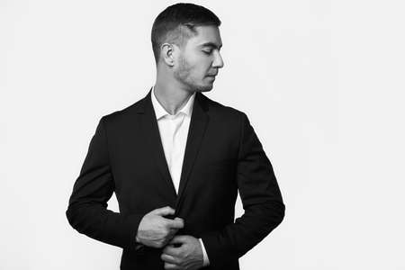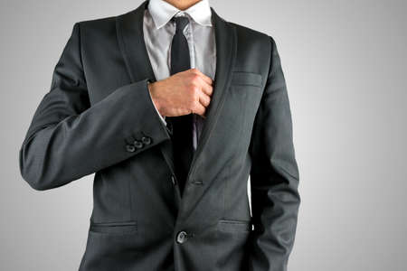 Close up of young businessman touching his black suit