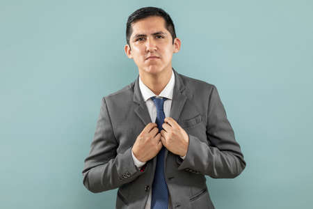 Cropped photo of white clever business people standing confidently, fastening his blazer with stubble on face isolated grey color background
