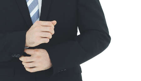 Business man dressing up by adjusting sleeve button on white background