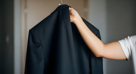 A close-up of a hand holding a black suit jacket on a hanger against a blurred background. The image focuses on the fabric and the act of selecting or preparing formal wear, suitable for business or event concepts.