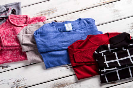 Bright and dark-colored sweaters. Sweaters on white wooden background. Warm clothing from fashion magazine. Few trendy sweaters.