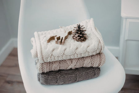 A stack of knitted sweaters in the interior of the living room. The concept of autumn winter comfort