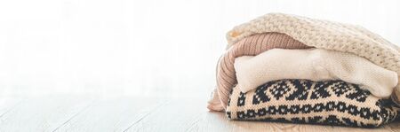 Stack of cozy knitted autumn and winter sweaters on a neutral background. Concept of warmth and comfort clothes. Banner
