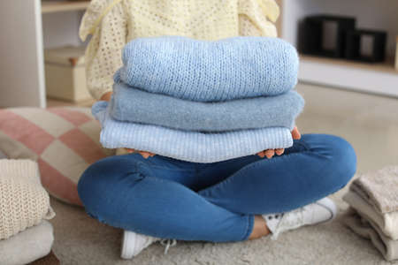Warm cozy clothes on chest of drawers in home interior. Knitted autumn sweaters. Organization.