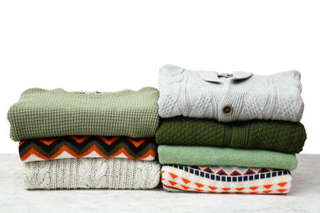 On the gray table, three warm wool sweaters with different patterns are stacked in a pile, ready for the cold. Winter time.