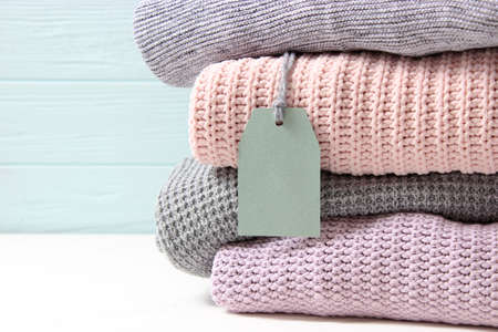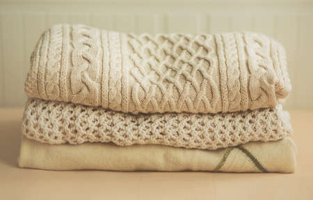 Warm knitted sweaters folded in a stack on a light background close-up.