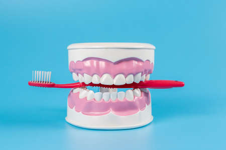 Clean teeth dental jaw model and red thooth brush on blue background. The concept of proper oral care, caries hygiene.
