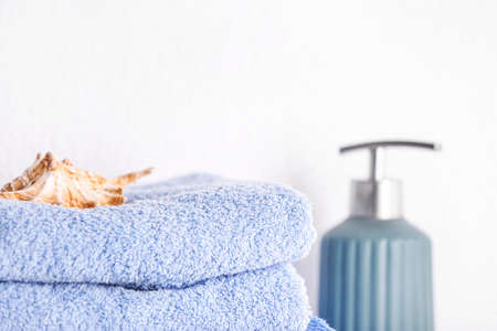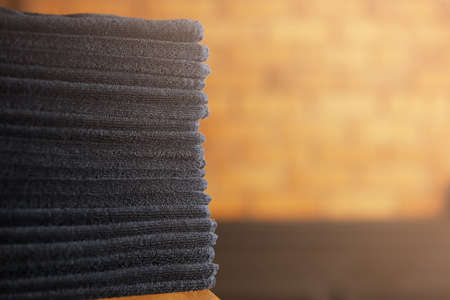 Stack of bath towels. Home textiles for spa treatments. Soft fluffy fabric texture.