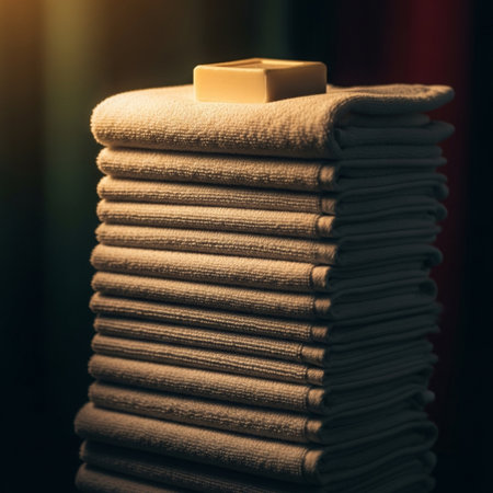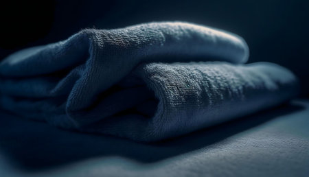 Close-up image of folded towels in low light, emphasizing texture and shadows.