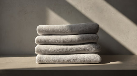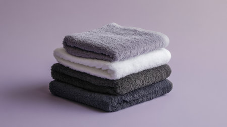 A stacked arrangement of soft towels in elegant shades of gray and white on a harmonious background, perfect for home d