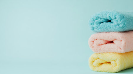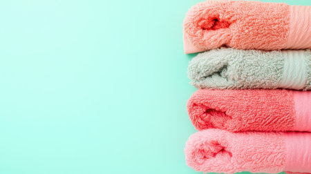 A stylish arrangement of colorful soft bath towels stacked on a gentle mint background, perfect for home decor or bathroom accessories, creating a cozy atmosphere.