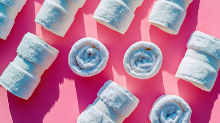 This high-quality image features neatly rolled white towels arranged on a vibrant pink background. Perfect for spa and wellness themes, the towels symbolize cleanliness and comfort, enhancing any relaxation setting.